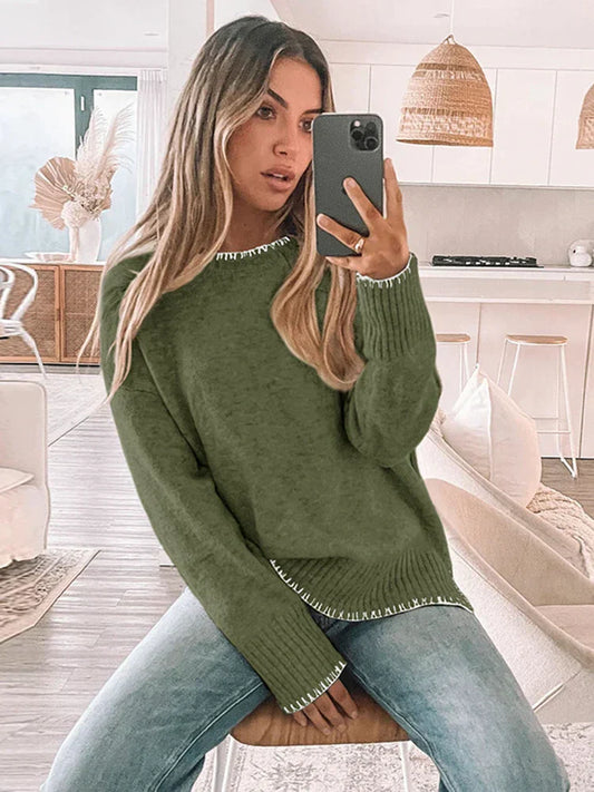 Womens Crewneck Pullover Sweater Long Sleeve Knit Slit
